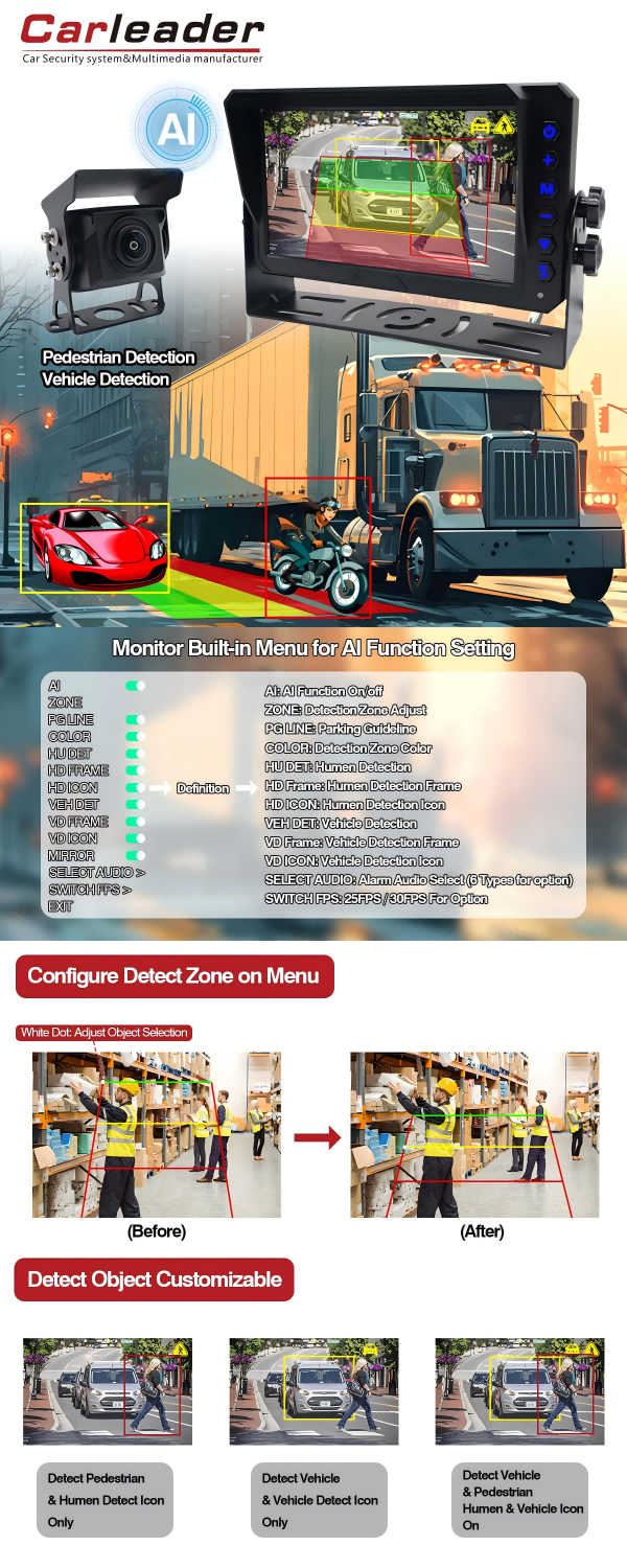Carleader 7 นิ้ว AI BSD ระบบตรวจสอบการตรวจจับจุดบอดรองรับ การสอบเทียบ AI ได้รับการออกแบบด้วยอัลกอริธึมความแม่นยำสูง AI ขั้นสูงและการทำงานของเมนู cz ที่ใช้งานง่าย ระบบกล้อง AI นี้ช่วยให้ผู้ขับขี่มีระบบเตือนคนเดินเท้าและยานพาหนะแบบไดนามิกในทุกสภาพอากาศและมีความแม่นยำสูง ซึ่งช่วยลดความเสี่ยงของอุบัติเหตุจราจรได้อย่างมีประสิทธิภาพ ระบบกล้องติดตาม AI เหมาะสำหรับรถยนต์ส่วนตัว ยานพาหนะเพื่อการพาณิชย์ และยานพาหนะพิเศษ ระบบ AI ของยานพาหนะมีการบูรณาการที่แข็งแกร่งและความเข้ากันได้ ความทนทาน และความสามารถในการตรวจสอบแบบเรียลไทม์