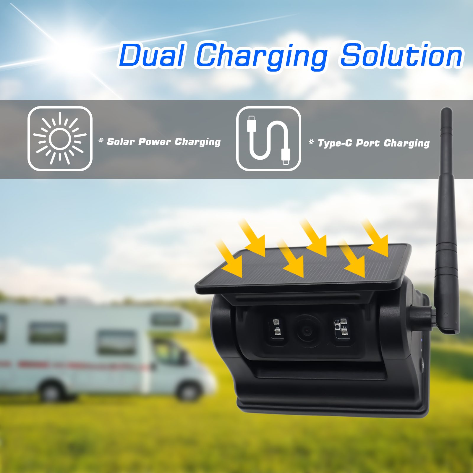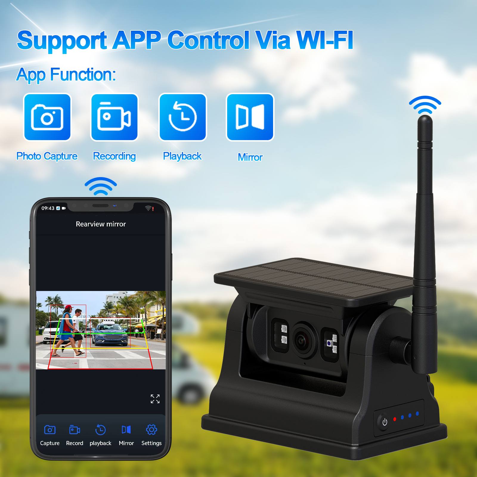 ผู้นำรถ กล้อง WIFI ถอยหลังแบบชาร์จพลังงานแสงอาทิตย์ตรวจจับ AI พร้อมฐานแม่เหล็ก,- ไม่ต้องเดินสายไฟ ติดตั้งง่ายด้วยฐานแม่เหล็ก กล้องถอยหลังไร้สายพลังงานแสงอาทิตย์ในตัวแบตเตอรี่แบบชาร์จความจุขนาดใหญ่ 10500mAh และมีฟังก์ชั่นการมองเห็นตอนกลางคืน นอกจากนี้ยังสามารถขับเคลื่อนด้วยพลังงานแสงอาทิตย์ ประหยัดพลังงาน และรักษาสิ่งแวดล้อม กล้องรองรับฟังก์ชั่นการตรวจจับ AI สามารถตรวจจับคนเดินเท้าและยานพาหนะได้เช่นกันรองรับการเชื่อมต่อกับโทรศัพท์มือถือผ่าน WIFI ช่วยให้ผู้ใช้สามารถถ่ายภาพ บันทึกวิดีโอและเล่นภาพ ปรับเทียบ AI เป็นต้น กล้องนี้เป็นตัวเลือกที่ดีที่สุดของคุณสำหรับอุปกรณ์ตรวจสอบความปลอดภัยของยานพาหนะเพื่อการขับขี่ยานพาหนะของคุณอย่างปลอดภัย