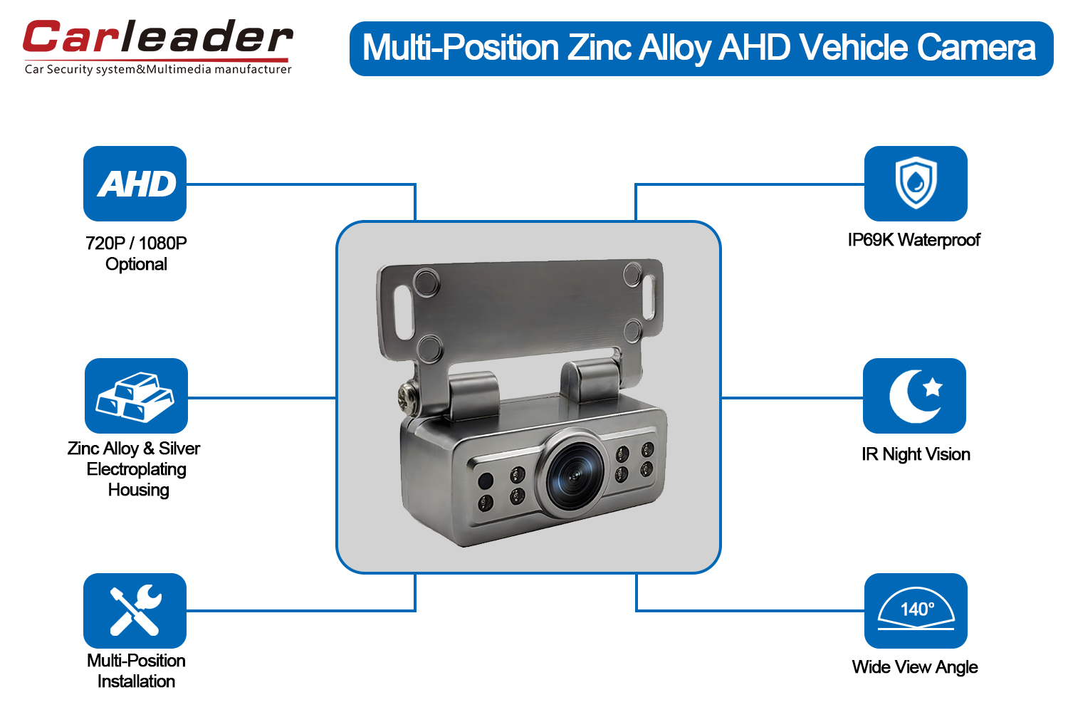 ผู้นำรถกล้องถอยหลังยานพาหนะชุบโลหะเงิน AHDพร้อมตัวเรือนโลหะผสมสังกะสีและการชุบด้วยไฟฟ้าสีเงิน มุมมองที่กว้าง 140 องศา และกันน้ำและกันฝุ่นระดับ IP69K มุมและตำแหน่งการติดตั้งสามารถยึดได้ด้วยสกรู