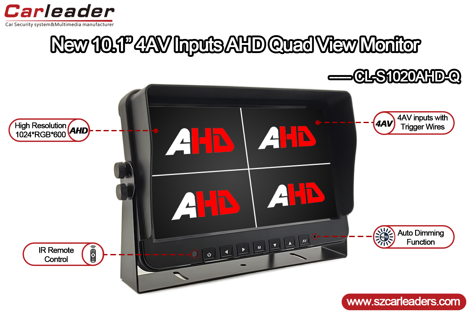 เหมาะสำหรับยานพาหนะ การรักษาความปลอดภัย และการใช้งานตรวจสอบทางอุตสาหกรรมผู้นำรถ10.1 นิ้ว 4CH Quad Display จอภาพ AHD สำหรับยานพาหนะหนักผสมผสานฟังก์ชันการทำงานที่แข็งแกร่ง คุณภาพการแสดงผลที่ชัดเจน และตัวเลือกที่ผู้ใช้กำหนดได้ในแพ็คเกจขนาดกะทัดรัดและทนทาน