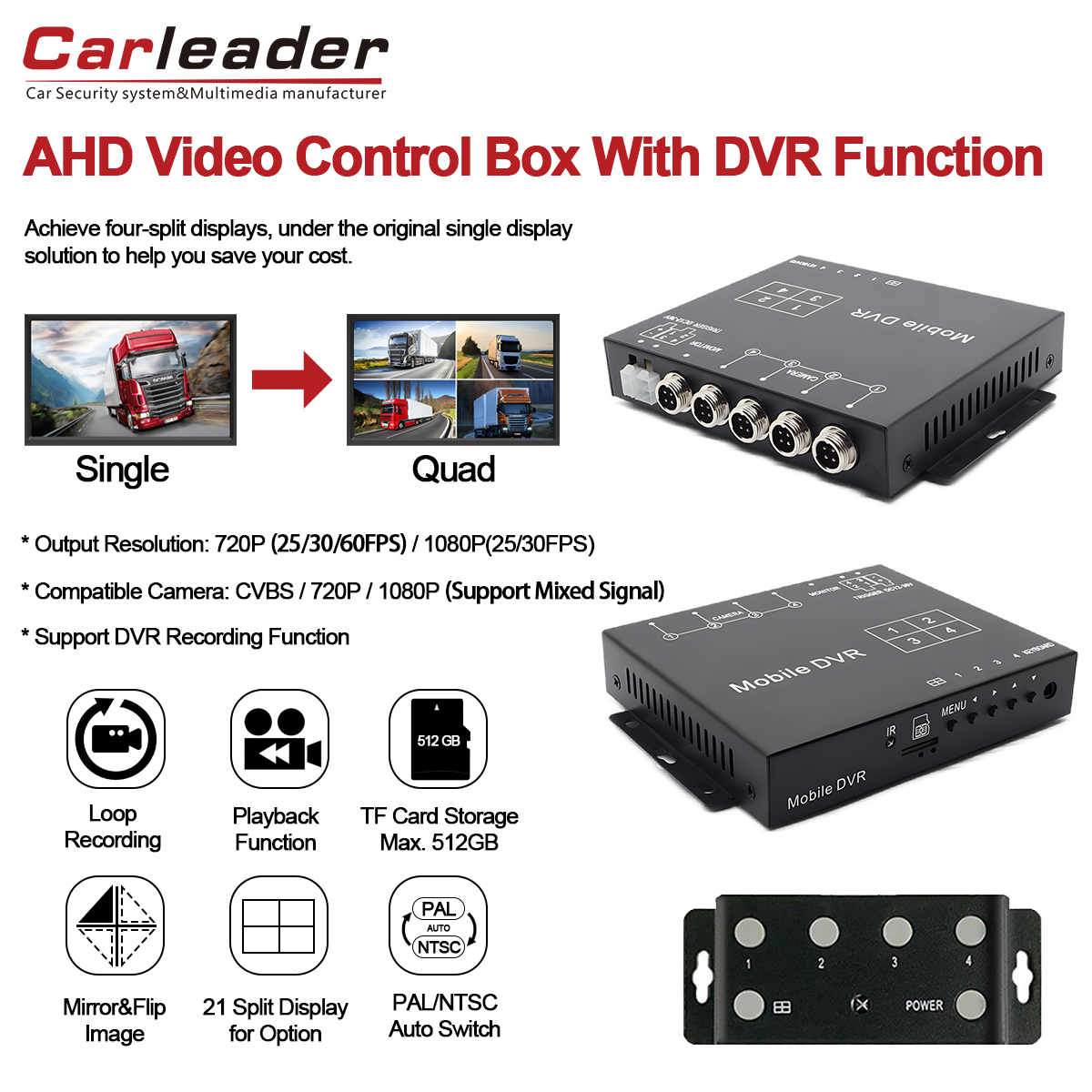 Carleader Quad Video Splitter Box ผสมผสานความสะดวกสบายของกล่องแยกวิดีโอ 4CH เข้ากับความปลอดภัยของฟังก์ชันการบันทึก DVR ชุดคุณลักษณะที่ครอบคลุม รวมถึงการตั้งค่ารูปภาพแยก โหมดทริกเกอร์ที่ยืดหยุ่น (สายทริกเกอร์และรีโมทคอนโทรล) การปรับขอบหน้าจอ อินพุตแรงดันไฟฟ้ากว้าง และการป้องกันที่แข็งแกร่ง มอบโซลูชันการเฝ้าระวังคุณภาพสูงที่เชื่อถือได้ซึ่งปรับแต่งมาสำหรับสภาพแวดล้อมเคลื่อนที่ที่มีความต้องการสูง รับรองการรับรู้สถานการณ์ที่สมบูรณ์และหลักฐานวิดีโอที่ปลอดภัยด้วยโปรเซสเซอร์วิดีโอ Carleader 1080P AHD Quad Split Display รองรับการบันทึกวิดีโอ.